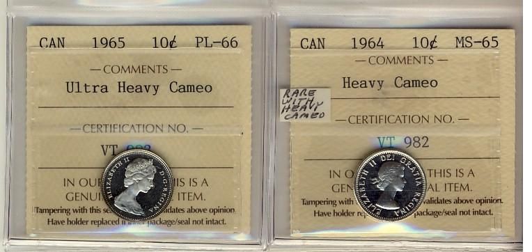 1964 10¢ ICCS MS65 Heavy Cameo & 1965 10¢ ICCS PL66 Ultra Heavy Cameo. Lot of 2 coins.