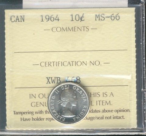 1964 10¢ ICCS MS66. Blast lustrous white.