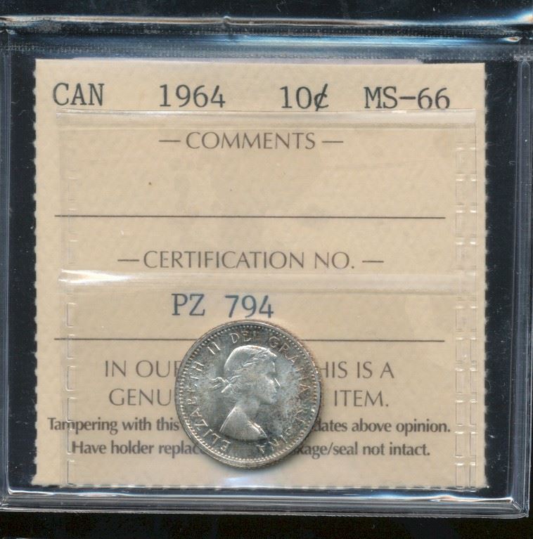 1964 10¢ ICCS MS66. Scattered tones of red and green.