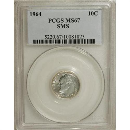 <B>1964 10C SMS MS67 PCGS.</B></I> Proof and business strike 1964 dimes are common, but Special Mint Set examples are rare. Apparently, a small number of Special Mint Sets were produced in 1964 as prototypes of the large-scale production with that finish beginning in 1965. The SMS pieces are satiny to prooflike, but lack the deep mirror fields of the regular 1964 proofs. This well struck and nearly brilliant Superb Gem has immaculate, striated fields and lacks any hint of cameo contrast. Population: 13 in 67, 3 finer (6/07).<BR><BR><B>Coin Engraver:</B> John R. Sinnock<BR><BR><b>Shipping:</b> Coins & Currency (<a target="_blank" href="http://www.heritageauctions.com/common/shipping.php">view shipping information</a>\)