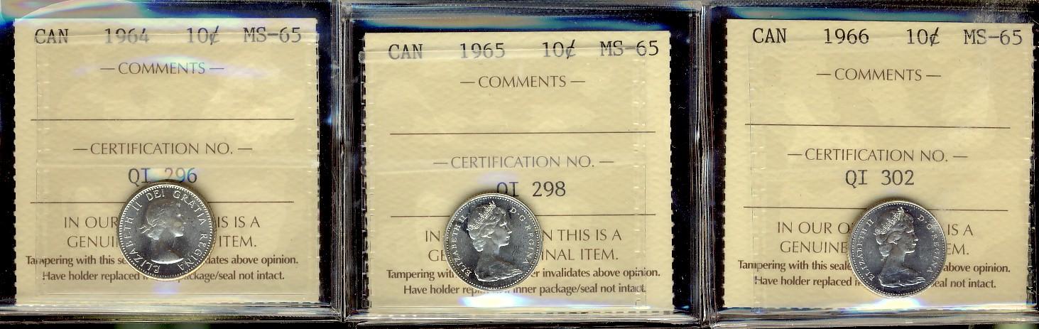 1964, 1965 & 1966 10¢ all ICCS MS65. Lot of 3 blast white coins.