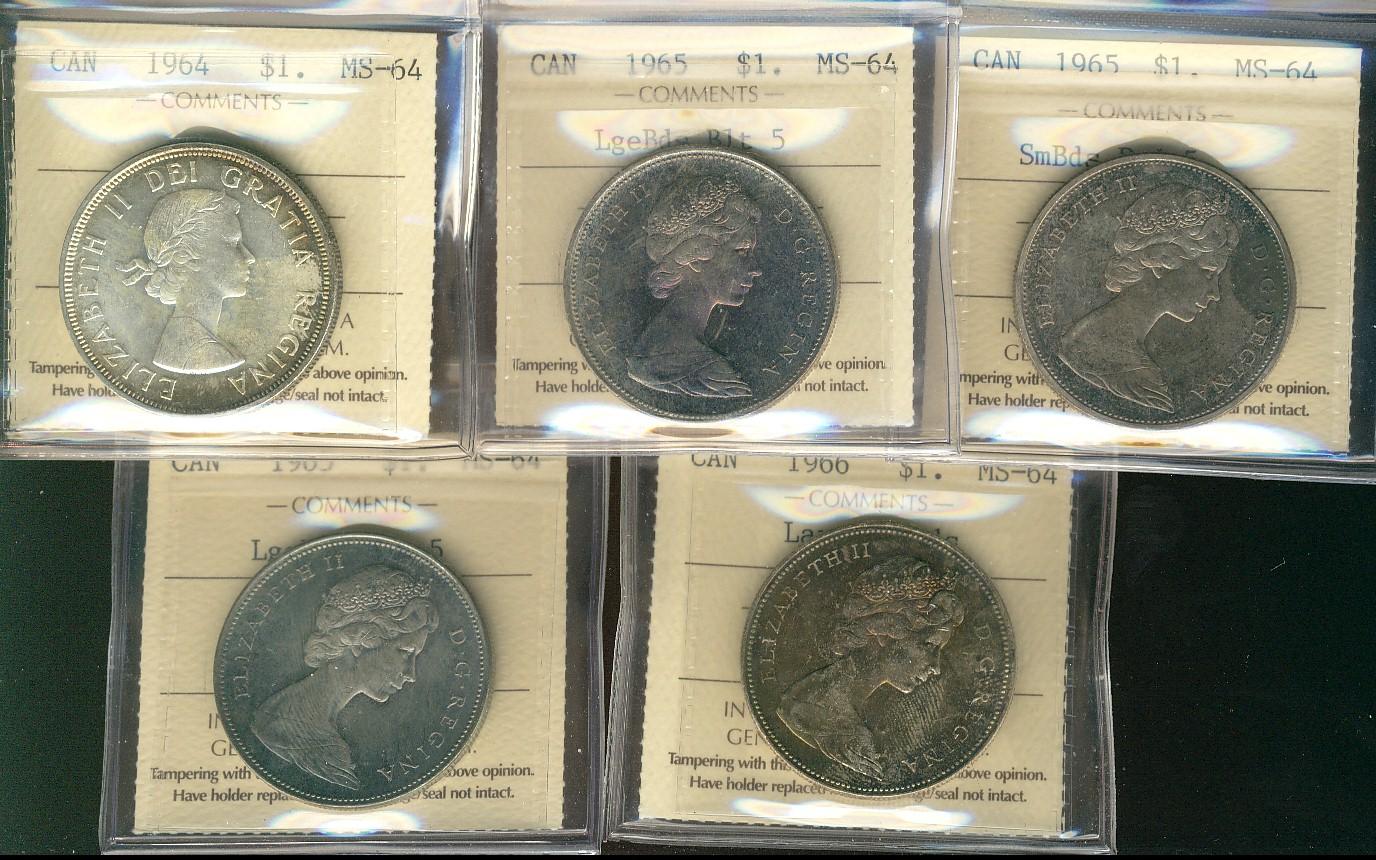 1964, 1965 SmBds Ptd, LgBds Blt(2) & 1966 ICCS $1 MS64. Lot of 5 coins all with great toning.