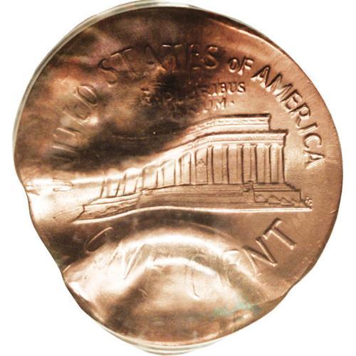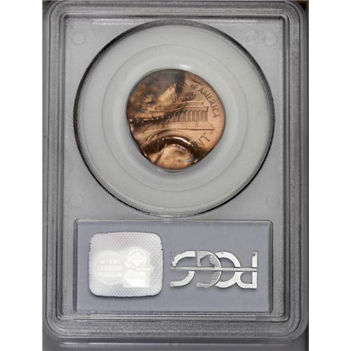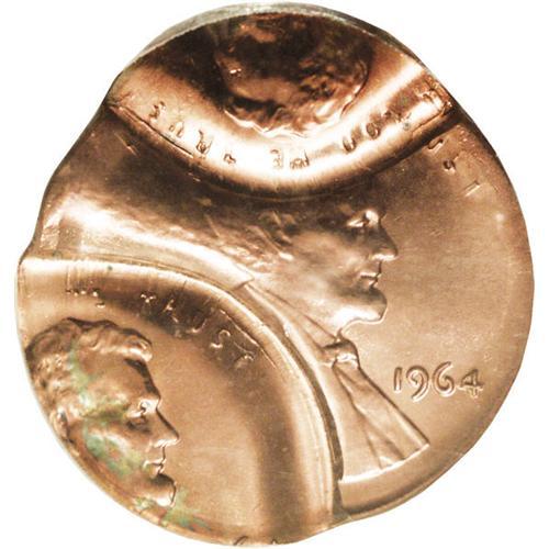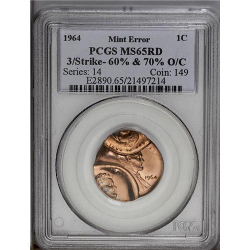 <B>1964<1C> Lincoln Cent--Triple Struck, 60% and 70% Off Center--MS65 Red PCGS.</B></I> The first strike was a centered broadstrike. The piece was struck two additional times, without any additional planchets fed between the dies. One of the additional strikes is 70% off center toward 5 o'clock, at 12 o'clock relative to the first strike. The other additional strike is 60% off center toward 7:30, at 7:30 relative to the first strike.