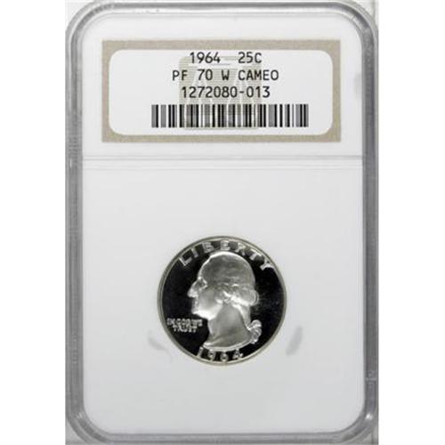 <B>1964 25C PR70 W Cameo NGC.</B></I> A perfect proof 1964 quarter, designated W for "white" in addition to the Cameo label. As the holder suggests, the surfaces are fully brilliant and untoned, and the contrast between the fields and devices is exceptional. Obviously the finest certified, and only a Deep Cameo piece would exceed this one for quality.<BR><BR><b>Shipping:</b> Coins & Currency (<a target="_blank" href="http://www.heritageauctions.com/common/shipping.php">view shipping information</a>)