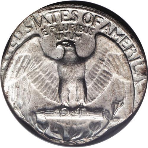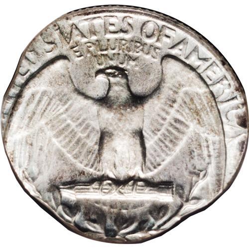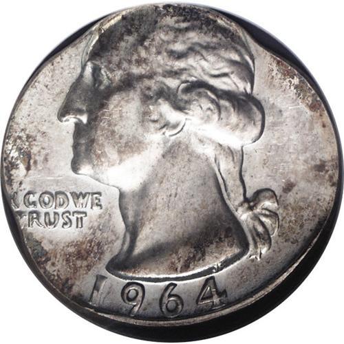<B>1964<25C> Washington Quarter--Struck on a Dime Planchet--MS64 NGC.</B></I> 2.5 grams. This shimmering near-Gem has dashes of lovely orange color on each side. LIBERTY and the denomination are off the flan; the date is intact but the mintmark area is absent. The weight corresponds to a silver dime planchet; a clad dime weighs 2.27 grams.<BR><I>From The Bellaire Collection.</B></I>