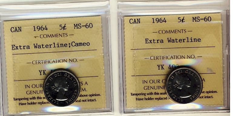 1964 5¢ EWL ICCS MS60. Lot of 2 coins, one with Cameo designation.