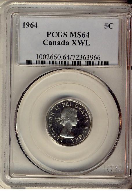 1964 5¢ XWL PCGS MS64. Light frost finish on portrait.
