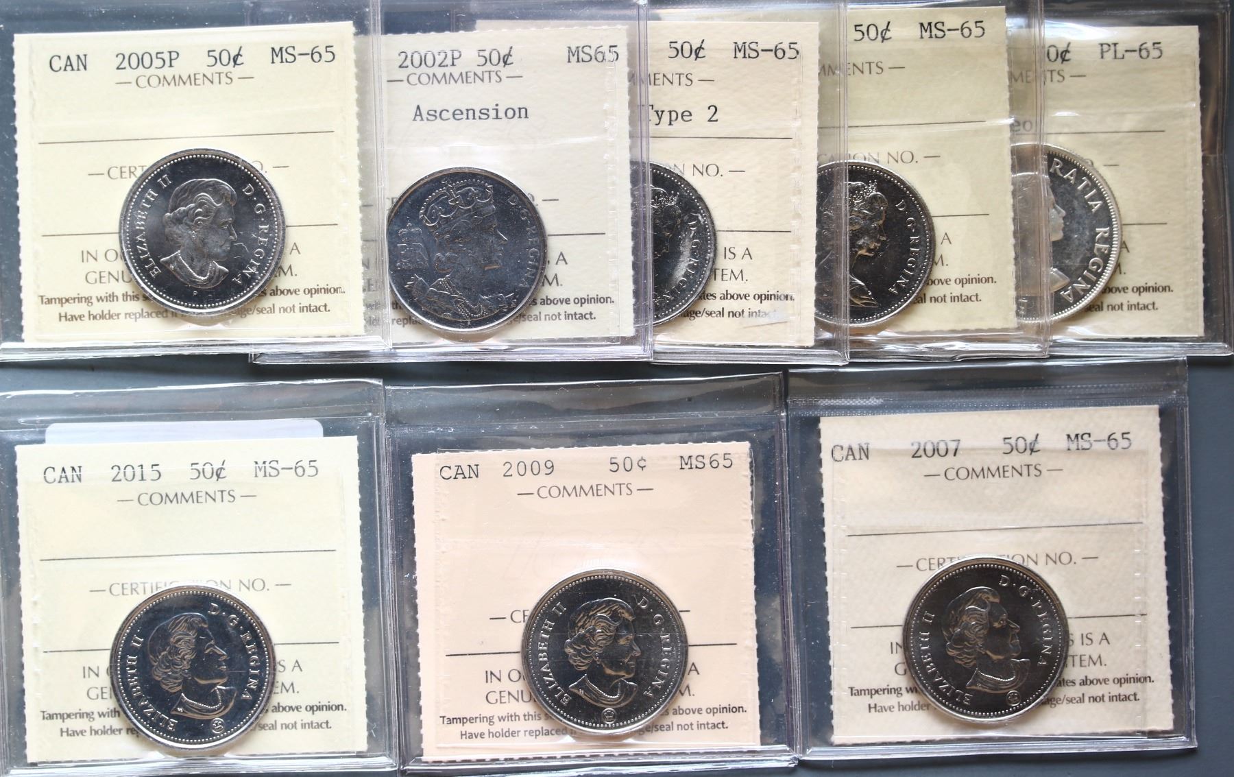 1964 50¢, 1979, 1982 T2, 2002P, 2005P, 2007, 2009 & 2015 all ICCS graded Gem Mint State-65 w/excepti