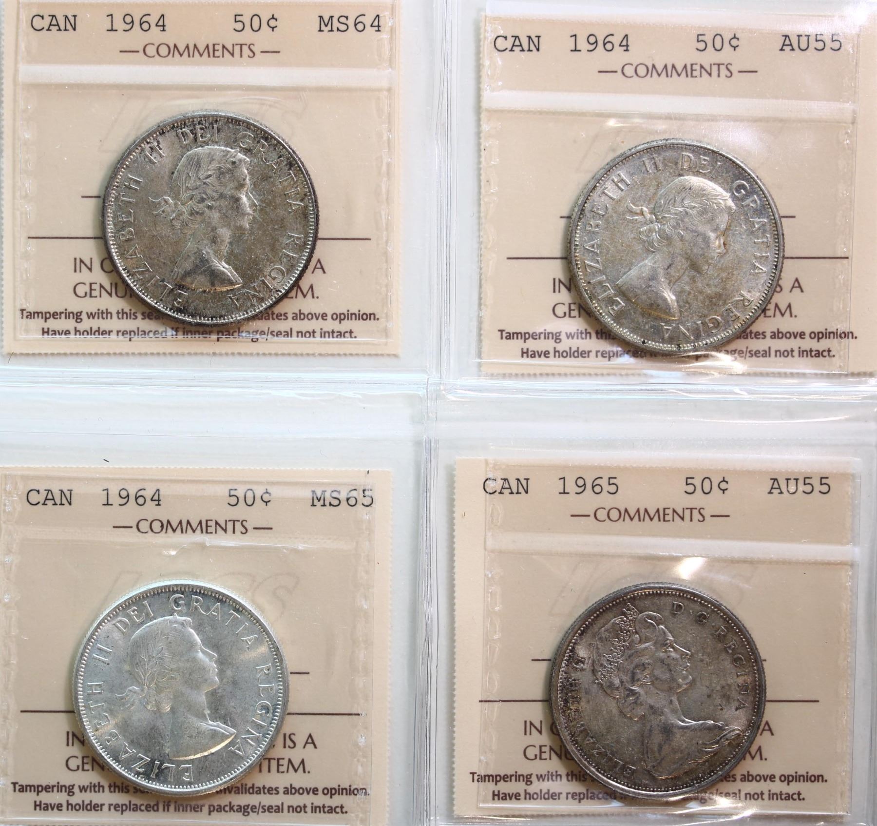 1964 50¢ (3), 1965, All 4 coins ICCS Choice About Uncirculated-55 to Gem Mint State-65.