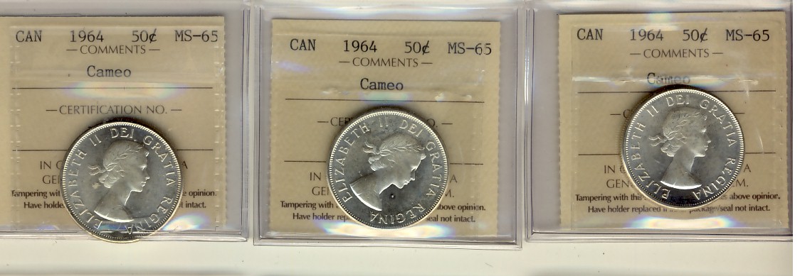 1964 50¢ ICCS MS65 Cameo.  Lot of 3 coins all full white.