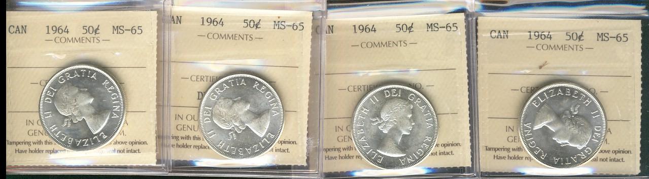 1964 50¢ ICCS MS65. Lot of 4 coins, all blast white.