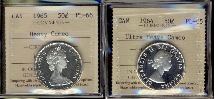 1964 50¢ PL65 ULTRA HEAVY CAMEO & 1965 50¢ ICCS PL66 Heavy Cameo. Lot of 2 coins.