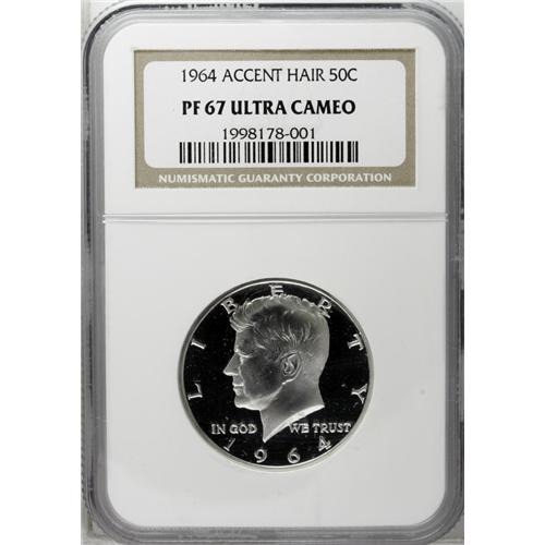 <B>1964<50C> Accented Hair PR67 Ultra Cameo NGC.</B></I> A thoroughly reflective example with heavily frosted devices that showcase Kennedy's accented hair. Census: 10 in 67 Deep Cameo, 9 finer (9/06).