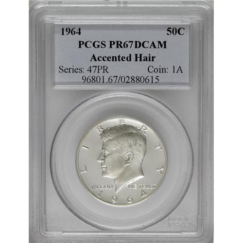 <B>1964<50C> Accented Hair PR67 Deep Cameo PCGS.</B></I> Totally white and attractive. This variant has entered the numismatic mainstream for the additional die work within Kennedy's hair. One of the finer examples graded, and worthy of a specialized collection. Population: 16 in 67, 8 finer (3/06).<BR><I>From The J. S. Hamilton Registry Set of Proof Kennedy Half Dollars.</B></I> <BR><BR><B>Important notice:</B> Heritage usually auctions material at the rate of 200-250 lots per hour. On some occasions eBay Live bid software or the Internet may not be able to keep up with the pace of the auction. We recommend placing a realistic absentee bid now as insurance to avoid disappointment. Occasionally the auctioneer may eliminate or reject an eBay Live bid, and the auctioneer may also reopen a lot after the close of the eBay live bidding (usually because we missed an audience bid), and may reject your bid even if it shows you as the winning bidder. By bidding via eBay Live, you agree that Heritage may award the lot to another bidder at its sole discretion under the circumstances described above or any other reasonable circumstances. Since eBay bids are not shown to us until we open the lot on the floor, we treat those bids just like floor bids. In most cases the floor responds before the eBay bid is presented to us, due to Internet lag time, so for consistency we have made it a policy that floor bids are always considered first over tie eBay live bids. Also please note that all Heritage lots purchased through eBay Live carry a 20% Buyer's Premium. Please make sure you read the Terms and Conditions before you bid. This lot is being auctioned in conjunction with a live floor auction by Heritage Galleries & Auctioneers. All final auction and invoice information will be supplied by Heritage Galleries & Auctioneers, and all other information should be considered preliminary. Lot:3171 <BR><BR><B>Winning Notification and Billing:</B> After the FINAL session in this auction is complete, Heritage will send e-mail and snail mail invoices. This process normally takes several days. All final auction and invoice information will be supplied by Heritage Galleries & Auctioneers, and all other information should be considered preliminary. <BR><BR>This auction will be conducted on a live auction floor and over the Internet through eBay Live. If you choose to place an absentee bid, please take a moment to <font color='#0000ff'><u><a href='http://pages.ebay.com/liveauctions/help/before/laabsentee.html'>learn how eBay Live absentee bidding works</a></u></font><font color='#000000'>