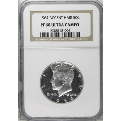 <B>1964<50C> Accented Hair PR68 Ultra Cameo NGC.</B></I> Type One Reverse. The ephemeral Accented Hair subtype is many times scarcer than the Normal Hair proof 1964 half. The present piece has exceptional eye appeal, since the devices are thickly frosted and nicely brought up. The glassy fields display infrequent freckles of gold patina.