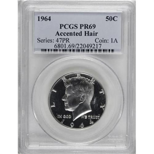 <B>1964 50C Accented Hair PR69 PCGS.</B></I> While both sides show subtle hints of contrast, the cameo effect is not strong enough to warrant a designation. The virtually immaculate surfaces host strongly detailed devices, with Kennedy's hair particularly prominent.<BR><BR><B>Coin Engraver:</B> Gilroy Roberts and Frank Gasparro<BR><BR><b>Shipping:</b> Coins & Currency (<a target="_blank" href="http://www.heritageauctions.com/common/shipping.php">view shipping information</a>)