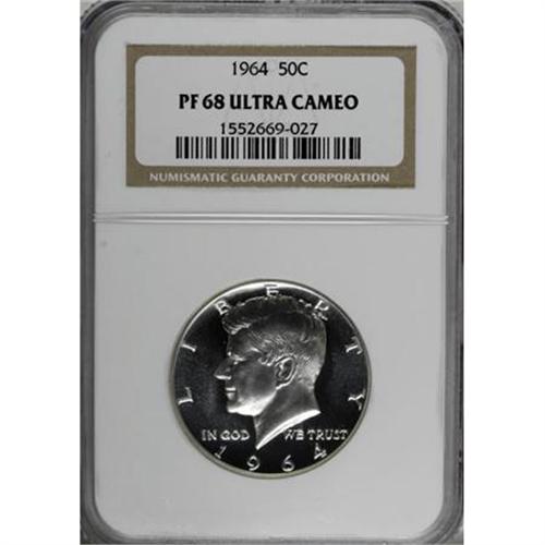 <B>1964 50C PR68 Deep Cameo NGC.</B></I> NGC Census: (251/69). PCGS Population (207/69). Numismedia Wsl. Price for NGC/PCGS coin in PR68: $220. (#96800)<BR><BR><b>Shipping:</b> Coins & Currency (<a target="_blank" href="http://www.heritageauctions.com/common/shipping.php">view shipping information</a>)