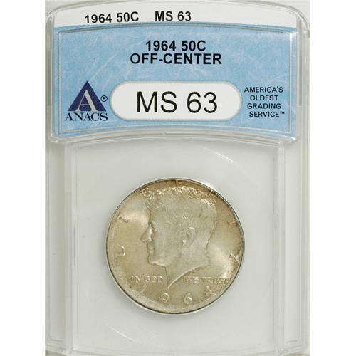 <B>1964 50C Half Dollar--Off-Center--MS63 ANACS.</B></I> NGC Census: (66/983). PCGS Population (98/2194). Mintage: 273,300,000. Numismedia Wsl. Price: $5.65. (#6706)<BR><BR><b>Shipping:</b> Coins & Currency (<a target="_blank" href="http://www.heritageauctions.com/common/shipping.php">view shipping information</a>)