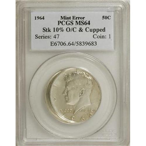 <B>1964 50C Half Dollar--Struck 10% Off Center and Cupped--MS64 PCGS.</B></I> <BR><BR><B>Coin Engraver:</B> Gilroy Roberts and Frank Gasparro<BR><BR><b>Shipping:</b> Coins & Currency (<a target="_blank" href="http://www.heritageauctions.com/common/shipping.php">view shipping information</a>\)