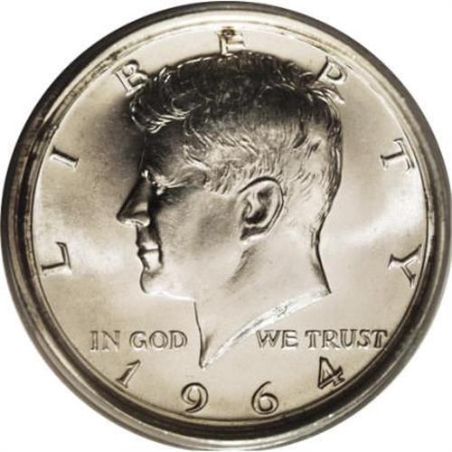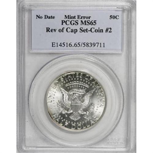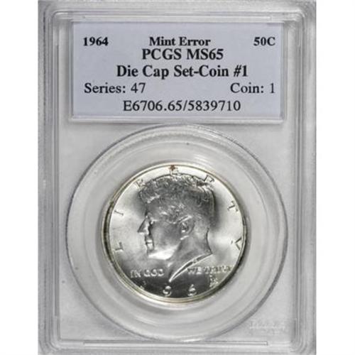 <B>1964 50C --Capped Die Set--MS65 PCGS.</B></I> Coin one is a uniface die cap with the obverse impression and coin two is a uniface reverse impression. Two planchets entered the coining chamber simultaneously, each planchet receiving an impression from a single die. The obverse half capped the die and continued to strike a few more uniface reverse pieces. Finally, it fell away, and remained with the last reverse piece that it struck. A delightful pair, showing the Mint at its worst.<BR><BR><B>Coin Engraver:</B> Gilroy Roberts and Frank Gasparro<BR><BR><b>Shipping:</b> Coins & Currency (<a target="_blank" href="http://www.heritageauctions.com/common/shipping.php">view shipping information</a>)