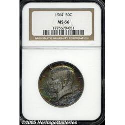 <B>1964 50C MS66 NGC.</B></I> Vibrantly rainbow colored on the obverse with reverse surfaces that are essentially brilliant. Both sides are lightly marked as one would expect from the lofty grade. Overall, an eye appealing piece that is rarely seen this nice. Population: 130 in 66, 41 finer (2/05).
