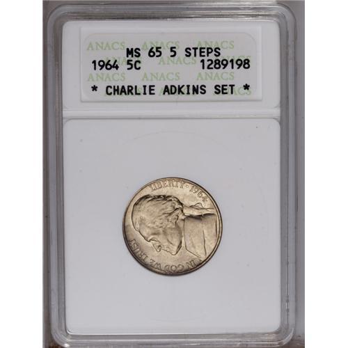 <B>1964 5C MS65 Five Steps ANACS.</B></I> Ex: Charlie Adkins Set. Light green-gold color graces this mildly prooflike and crisply struck Gem. The strike is good, but not sufficient to fully efface a few planchet marks near the jaw.