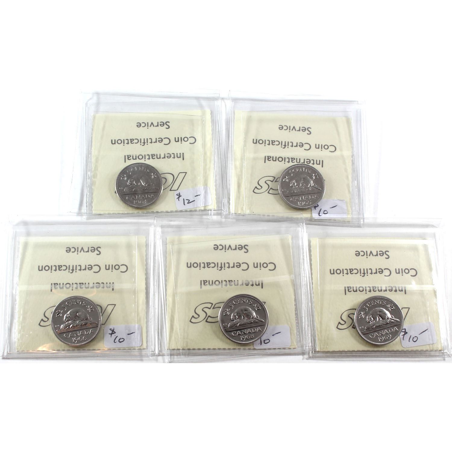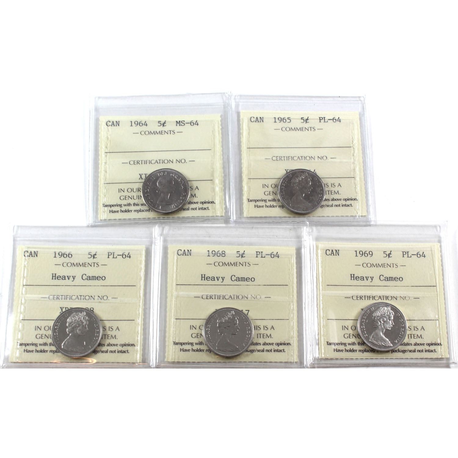 1964 5c MS64, 1965 5c PL64, 1966 5c PL-64 Heavy Cameo, 1968 5c PL-64 Heavy Cameo & 1969 5c PL-64 Heavy Cameo ICCS Certified. 5pcs
