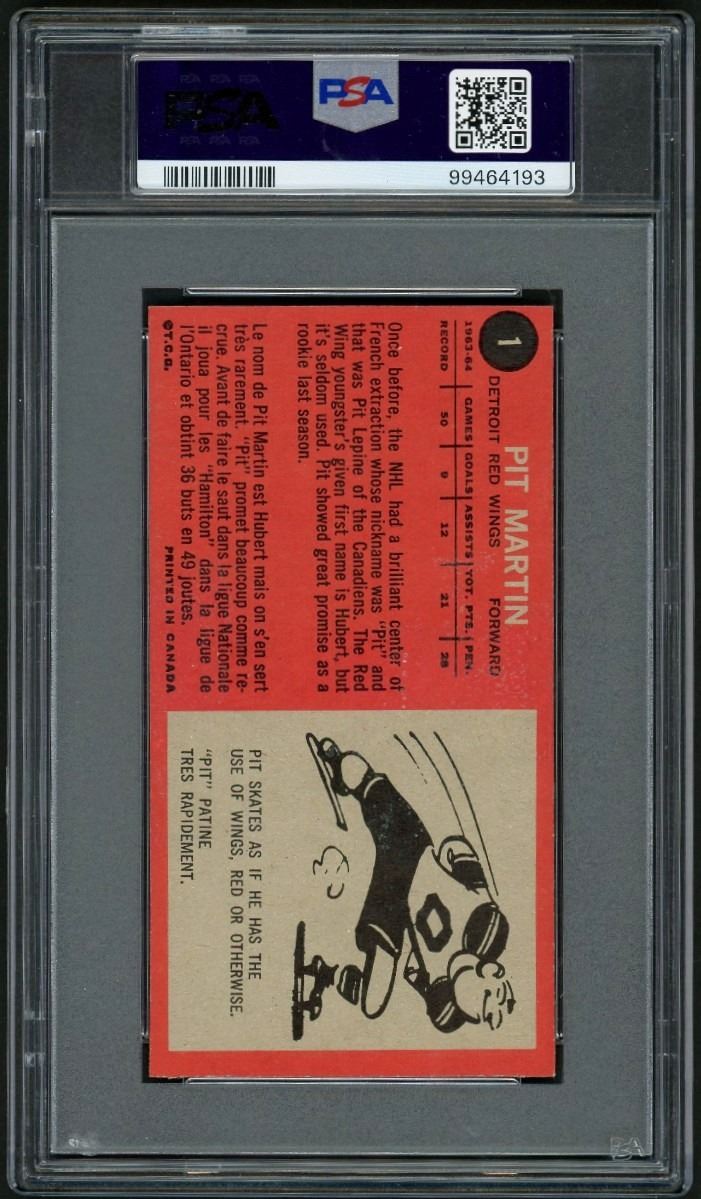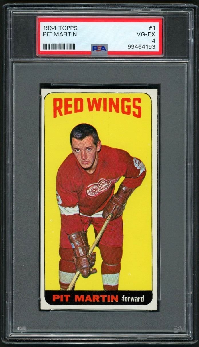 Tough #1, rookie card of long time NHLer, Pit Martin, who played 17 NHL seasons and made four all-star game appearances. Graded 4 VG-EX by PSA.
