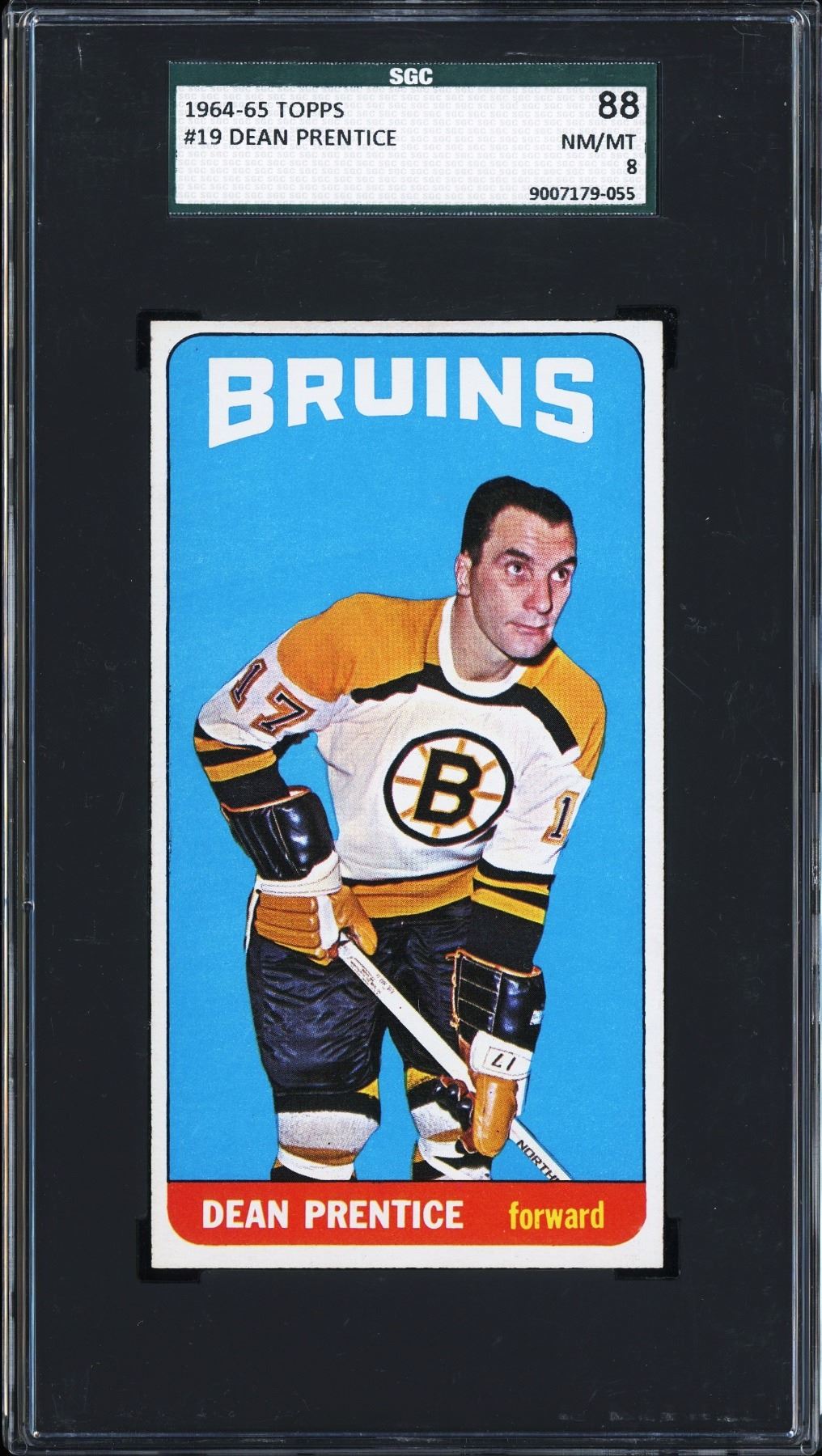 High grade 'Tall Boy' featuring longtime NHLer, Dean Prentice, who played 22 productive seasons (11 with the NY Rangers) scoring 20+ goals 10 times (+ 2 more seasons with 19 goals). High grade 64 Topps cards are always in demand! Graded 8 NM-MT by SGX