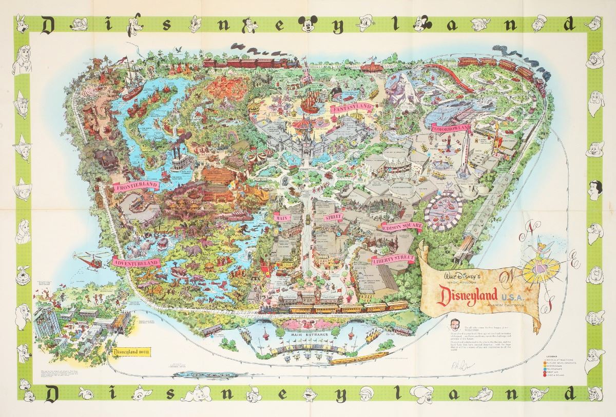 (Disneyland, 1964) Large-scale Disneyland park map designed by Sam McKim. This 1964 version "B" map features features a green border with Disney characters and stars. In this version of the map, the "Great Moments with Mr. Lincoln" attraction makes its debut. Signed in the bottom right by legendary Disney Imagineer Bob Gurr. Stored folded, as originally sold. Measures 30"x45". In fair condition with some spots of staining and wear.