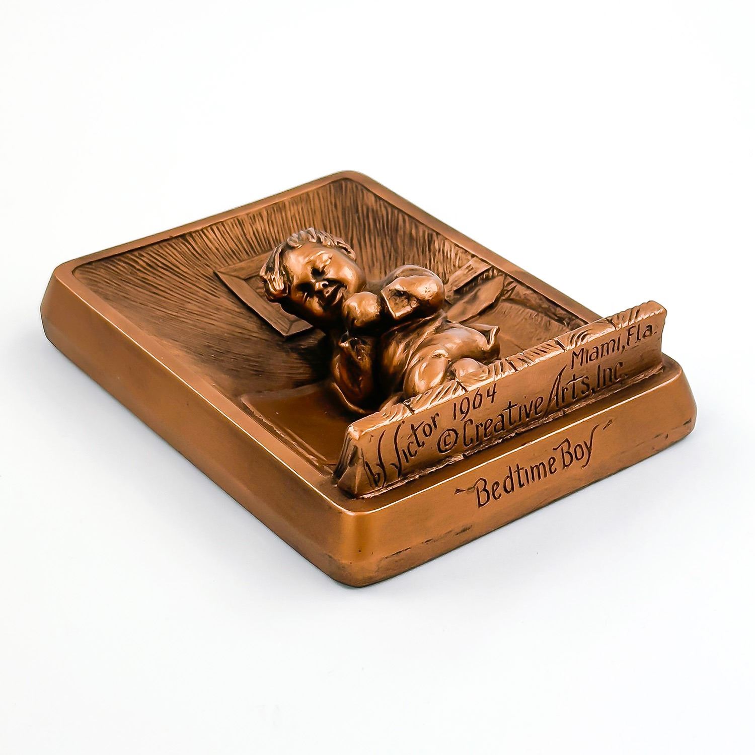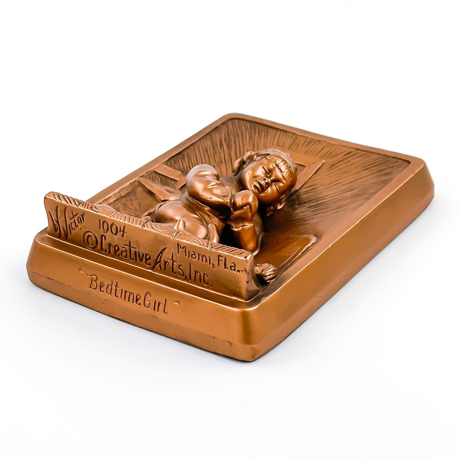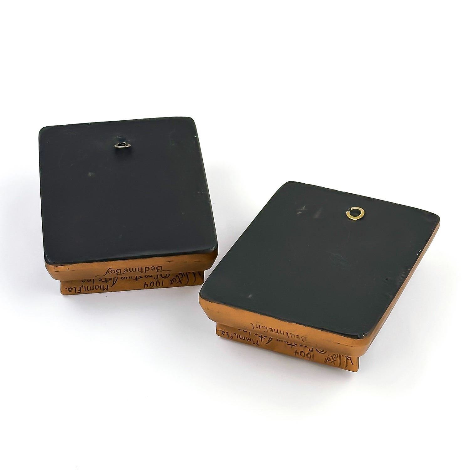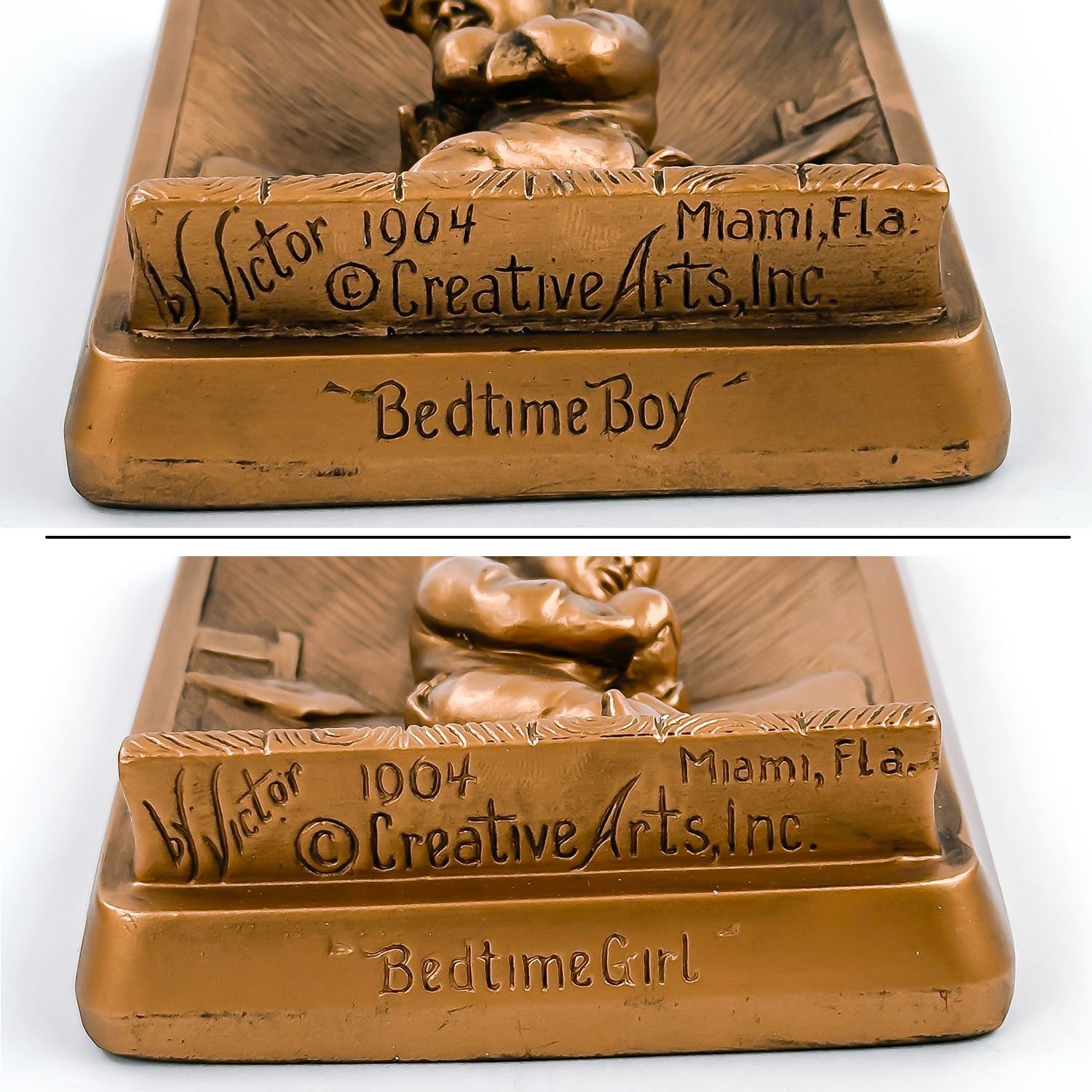 #8355 - PAIR OF COLLECTIBLE 3D 3-DIMENSIONAL VINTAGE CHALKWARE WALL DECOR PLAQUES BY VICTOR - 1964 MIAMI, FLORIDA - BEDTIME GIRL & BEDTIME BOY. GIRL AND BOY PRAYING BEFORE BEDTIME - SLINGSHOT, FROG, BALL & RAGGEDY ANN DOLL SIT ON THE FLOOR. BRONZE COLOR HOME WALL DECOR SCULPTURES - RELIGIOUS. EXCELLENT CONDITION FOR BEING 60 YEARS OLD - WITH NO CRACKS, CHIPS OR REPAIRS. THEY EACH MEASURE: 4.5” (11.5 CM) WIDE BY 6” (15 CM) TALL AND 1.5” (4 CM) DEEP