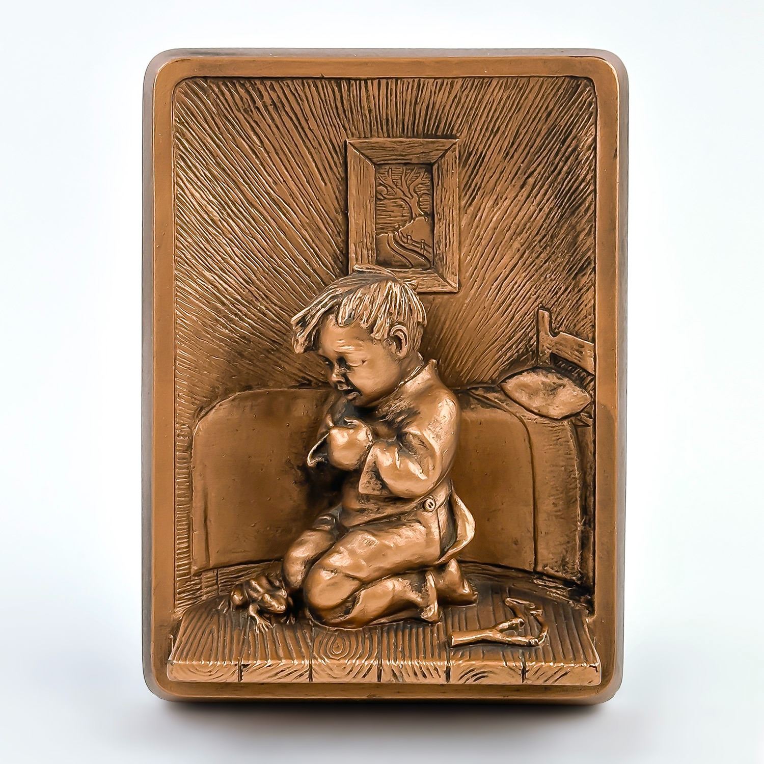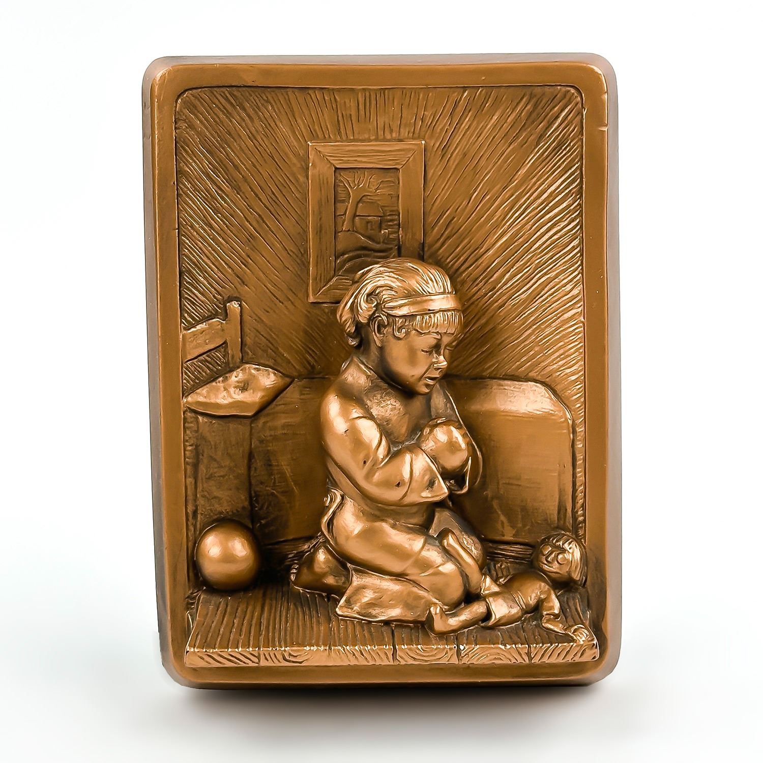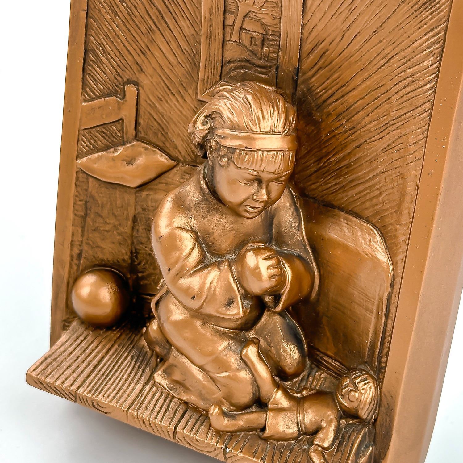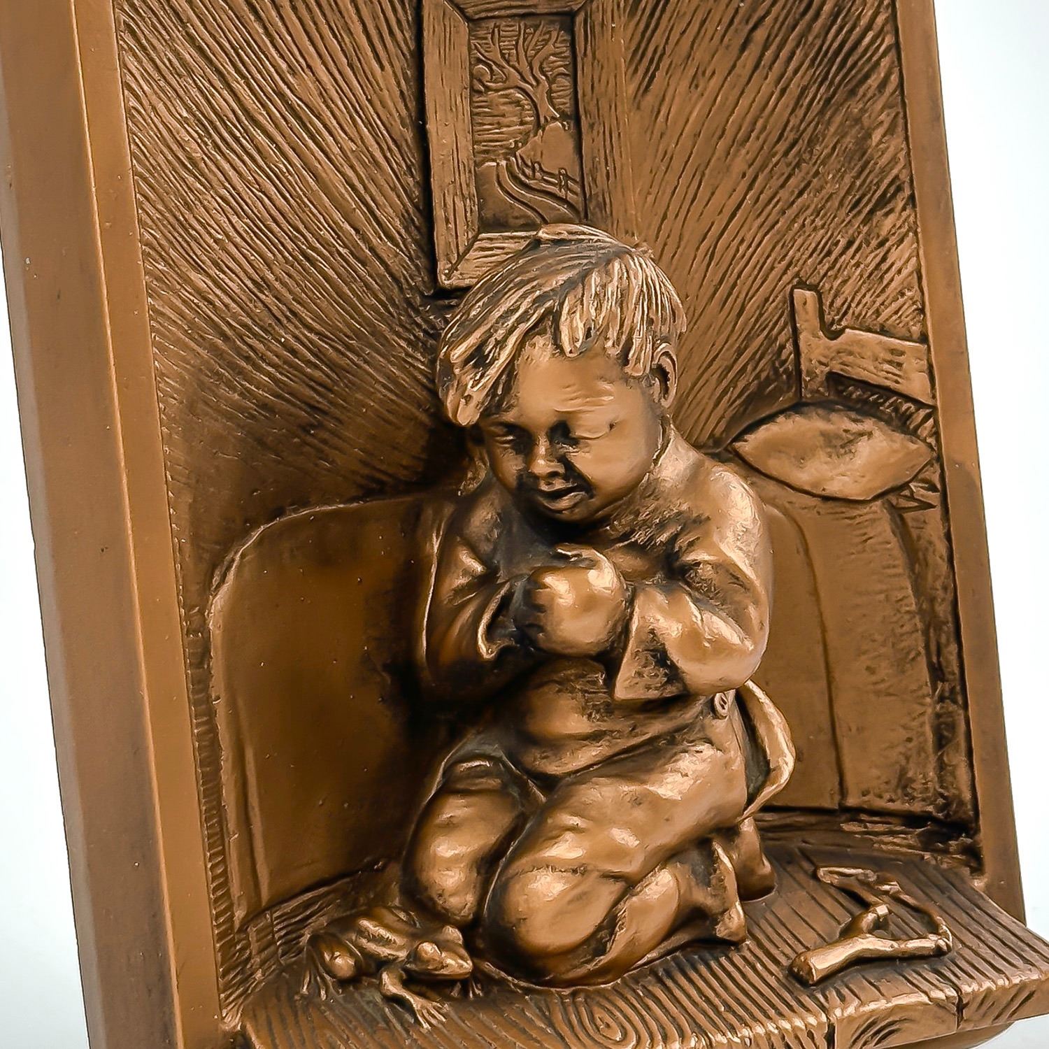 #8355 - PAIR OF COLLECTIBLE 3D 3-DIMENSIONAL VINTAGE CHALKWARE WALL DECOR PLAQUES BY VICTOR - 1964 MIAMI, FLORIDA - BEDTIME GIRL & BEDTIME BOY. GIRL AND BOY PRAYING BEFORE BEDTIME - SLINGSHOT, FROG, BALL & RAGGEDY ANN DOLL SIT ON THE FLOOR. BRONZE COLOR HOME WALL DECOR SCULPTURES - RELIGIOUS. EXCELLENT CONDITION FOR BEING 60 YEARS OLD - WITH NO CRACKS, CHIPS OR REPAIRS. THEY EACH MEASURE: 4.5” (11.5 CM) WIDE BY 6” (15 CM) TALL AND 1.5” (4 CM) DEEP