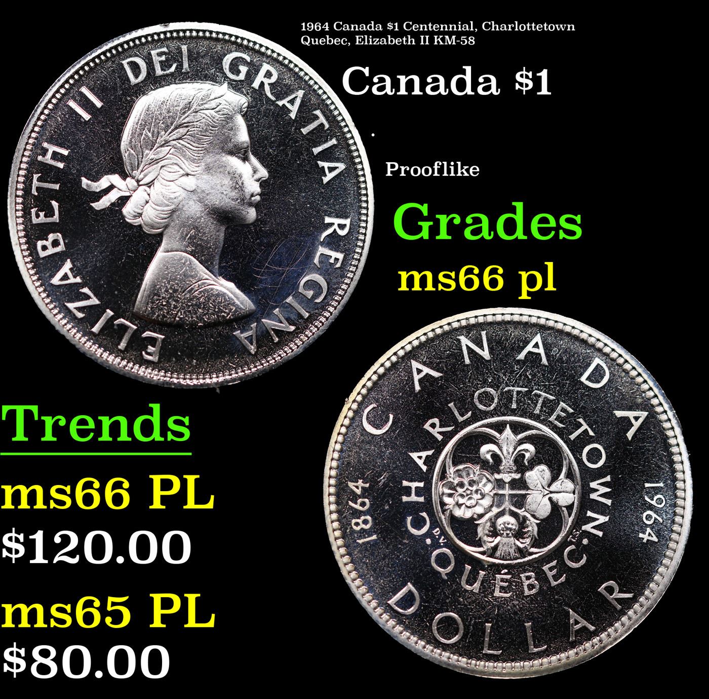 1964 Canada $1 Centennial, Charlottetown Quebec, Elizabeth II KM-58 Grades GEM+ UNC PL