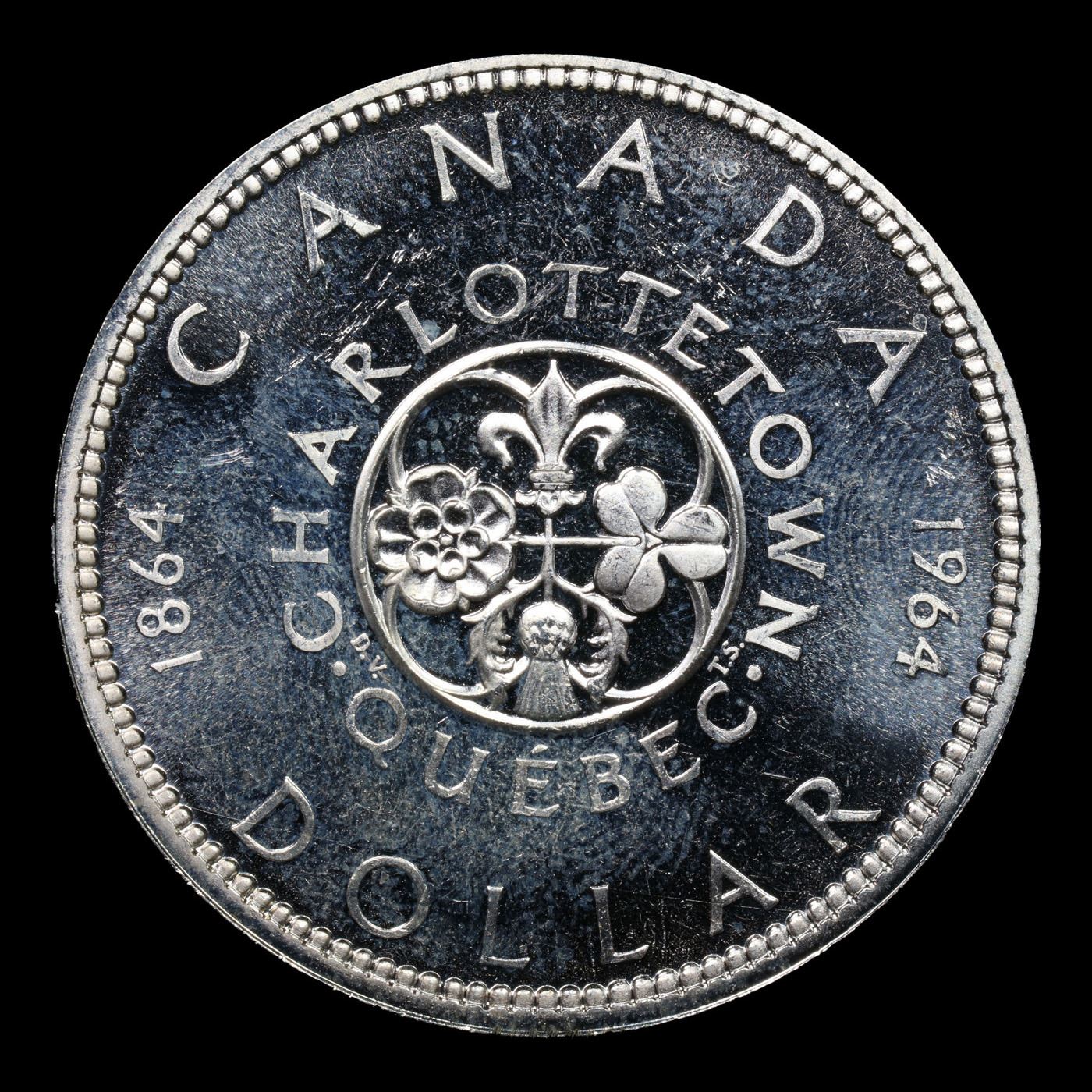 1964 Canada Dollar $1 Grades GEM+ UNC PL. 1964 represented the 100th Anniversary of the historic meetings in Charlottetown and Quebec City in 1864 that began the process of moving from individual colonies to a single confederation. The reverse, designed by Dinko Vodanovic and Thomas Shingles, prominently features a circle with a the French fleur-de-lis, Irish shamrock, Scottish thistle, and English rose all conjoined with “CHARLOTTETOWN” and “QUEBEC” outside of the circle. Flanking the circle design are the designer's initials, D.V. to the left and T.S. to the right. On the outer periphery are the words “CANADA”, “DOLLAR”, and the dual date “1864 1964”.