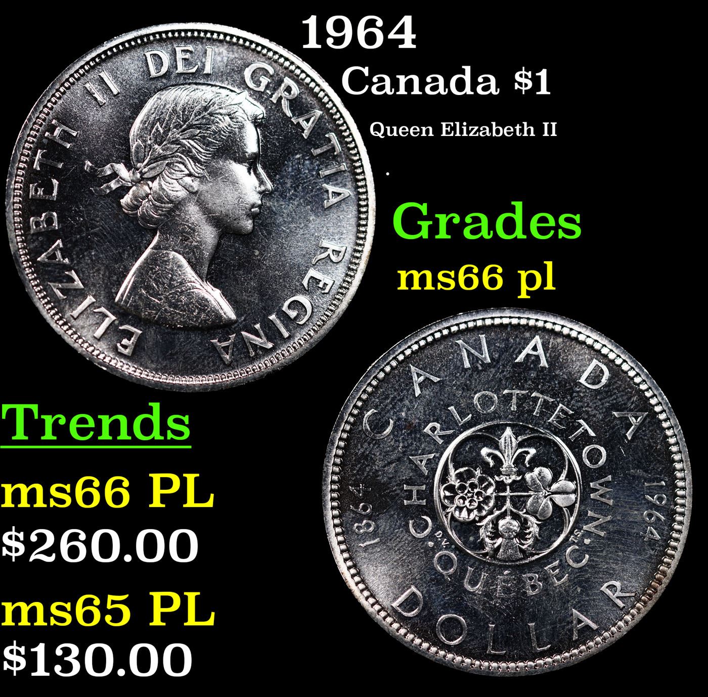 1964 Canada Dollar $1 Grades GEM+ UNC PL. Elizabeth was born in Mayfair, London, as the first child of the Duke and Duchess of York (later King George VI and Queen Elizabeth). Her father acceded to the throne in 1936 upon the abdication of his brother, King Edward VIII, making Elizabeth the heir presumptive. She was educated privately at home and began to undertake public duties during the Second World War, serving in the Auxiliary Territorial Service. In November 1947, she married Philip Mountbatten, a former prince of Greece and Denmark, and their marriage lasted 73 years until Philip's death in 2021. They had four children: Charles, Prince of Wales; Anne, Princess Royal; Prince Andrew, Duke of York; and Prince Edward, Earl of Wessex.When her father died in February 1952, Elizabeth—then 25 years old—became queen regnant of seven independent Commonwealth countries: the United Kingdom, Canada, Australia, New Zealand, South Africa, Pakistan, and Ceylon, as well as Head of the Commonwealth. Elizabeth has reigned as a constitutional monarch through major political changes such as the Troubles in Northern Ireland, devolution in the United Kingdom, the decolonisation of Africa, and the United Kingdom's accession to the European Communities and withdrawal from the European Union. The number of her realms has varied over time as territories have gained independence, and as some realms have become republics. Her many historic visits and meetings include state visits to the People's Republic of China in 1986, the Russian Federation in 1994, the Republic of Ireland in 2011, and visits to or from five popes.Significant events have included Elizabeth's coronation in 1953 and the celebrations of her Silver, Golden, Diamond and Platinum jubilees in 1977, 2002, 2012, and 2022, respectively. Elizabeth is the longest-lived and longest-reigning British monarch, the oldest and longest-serving incumbent head of state, and the second-longest reigning sovereign monarch in world history. She has faced occasional republican sentiment and press criticism of the royal family, particularly after the breakdown of her children's marriages, her annus horribilis in 1992, and the death in 1997 of her former daughter-in-law Diana, Princess of Wales. However, support for the monarchy in the United Kingdom has been and remains high, as does her personal popularity. Elizabeth died aged 96 at Balmoral Castle, Aberdeenshire, and was succeeded by her eldest son, Charles III.