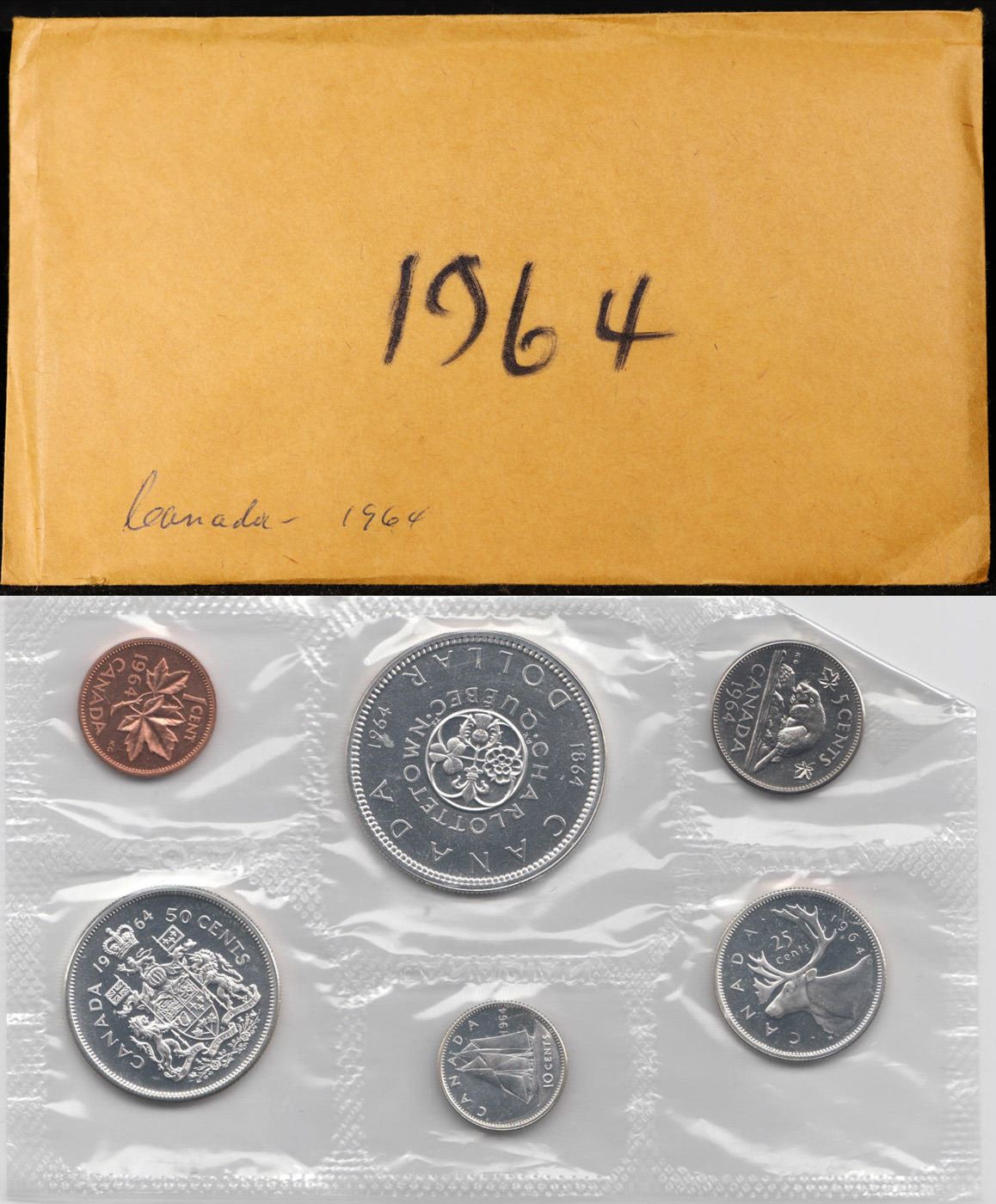 1964 Canadian Prooflike Silver Set. The Canadian Proof Like Mint Set is minted by the Royal Canadian Mint. It comes in it original packaging and COA. 6 coins that are uncirculated Canadian coins in which 4 are made with 80% silver 20% copper alloy. This product contains approximately 1.11 troy ounces of fine silver: 1 Canadian Silver Dollar – 80% Silver – Weight: 23.33 g. 1 Canadian Silver 50 Cent Piece – 80% Silver – Weight: 11.66 g. 1 Canadian Silver 25 Cent Piece – 80% Silver – Weight: 5.83 g. 1 Canadian Silver 10 Cent Piece – 80% Silver – Weight: 2.31 g. 1 Canadian Nickel 5 Cent Piece – Weight: 4.59 g. 1 Canadian Bronze Penny – Weight: 3.24 g