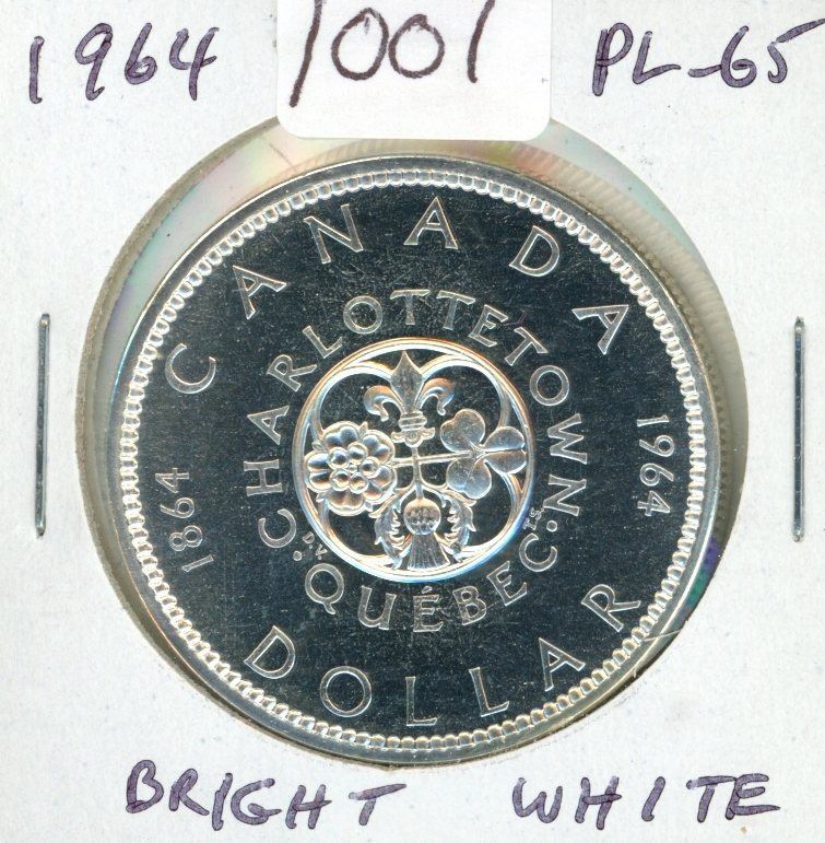 1964 Canadian Silver Dollar. Commemorates the pre-Confederation meetings in Charlottetown and Quebec City. Proof Like-65. Bright White. Nice.
