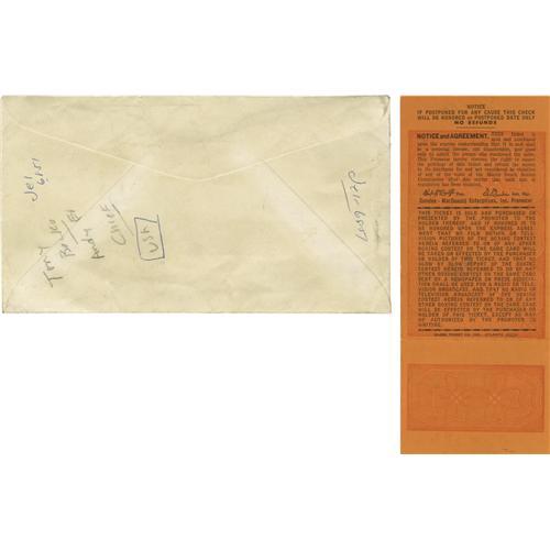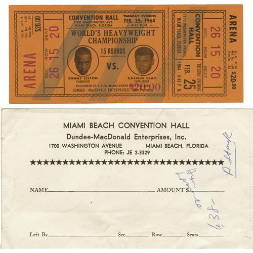 <B>1964 Clay vs. Liston I Full Ticket.</B></I> On February 25, 1964 at Miami Beach, Florida World Heavyweight Champion Sonny Liston defended his title against upstart, undefeated challenger, Cassius Clay of Louisville. Clay, 'the Louisville Lip," came into the fight a tremendous underdog to the seemingly invincible Sonny Liston. Liston, fresh off two consecutive one-round knockouts of Floyd Patterson, was predicted by most observers to be an easy choice to stop Clay in one round. It did not happen. Using his youth, speed and power Clay was able to batter Liston swelling up his eye and eventually forcing him to retire before the start of the seventh round. Clay had shaken the boxing world and had won his first Heavyweight Championship. Presented here is a very scarce full, unused ticket to the historic bout. This is an illustrated full, unused ticket picturing both fighters. It is a $20.00 arena style which includes a section, row and seat number. The ticket is in excellent condition with good color, no creases, clean front and back and the stub firmly attached. The ticket is accompanied by the envelope from the promoter of the fight Chris Dundee in which it was left for the attendee (who, luckily for us, did not attend). One of the most sought after full, unused boxing tickets in the hobby. <I>LOA from Craig Hamilton / JO Sports.</B></I>