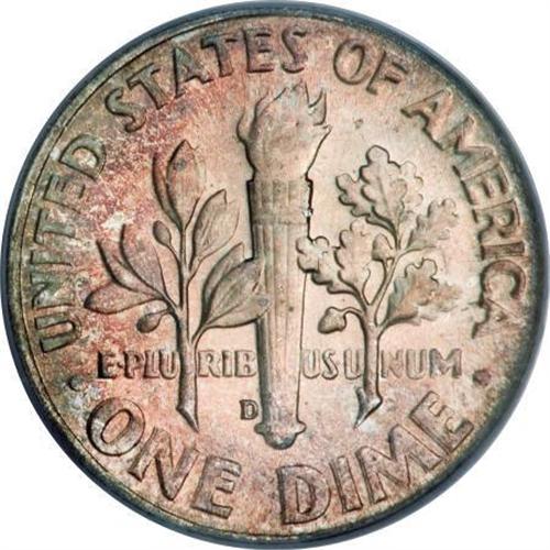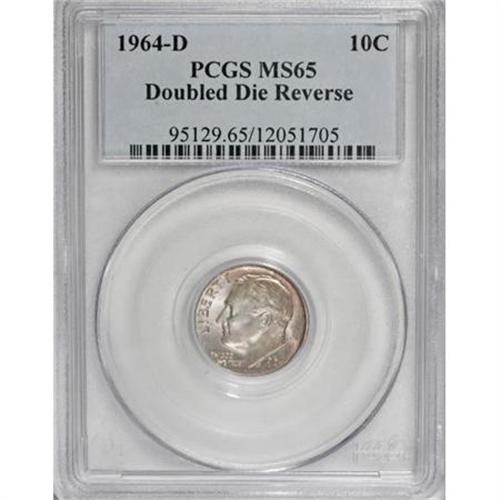 <B>1964-D 10C Doubled Die Reverse MS65 PCGS.</B></I> FS-803. A prominent variety listed in the 2008 Guide Book. The die doubling is strongest on DIME and AMERICA, although other reverse elements are affected. This lustrous Gem has lovely light rose-red and olive toning. Roosevelt's profile is brilliant. Population: 6 in 65, 0 finer (11/07).<BR><BR><B>Coin Engraver:</B> John R. Sinnock<BR><BR><b>Shipping:</b> Coins & Currency (<a target="_blank" href="http://www.heritageauctions.com/common/shipping.php">view shipping information</a>)