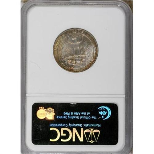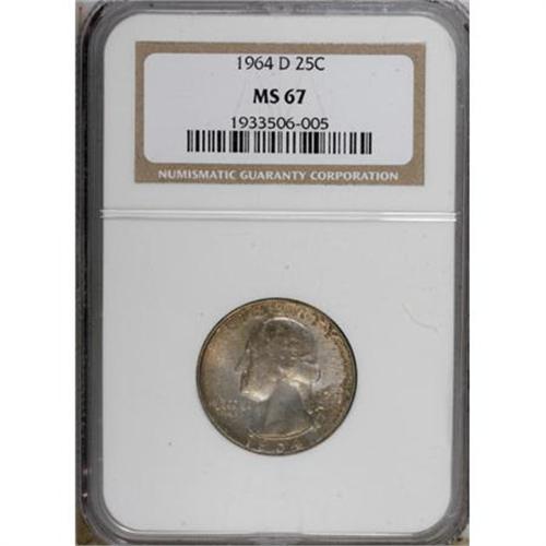 <B>1964-D 25C MS67 NGC.</B></I> The final year for regular-issue silver Washington quarters. This example is boldly struck with vibrant luster and crescents of rich, variegated coloration on both sides. Census: 55 in 67, 0 finer (6/07). <BR><BR><b>Shipping:</b> Coins & Currency (<a target="_blank" href="http://www.heritageauctions.com/common/shipping.php">view shipping information</a>)