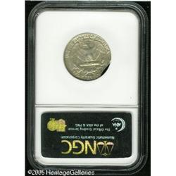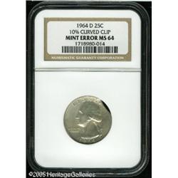 <B>1964-D 25C  Washington Quarter--10% Curved Clip--MS64 NGC.</B></I> A lustrous pearl-gray near-Gem with pleasing preservation. The clip is located between 1 and 3 o'clock. Details are soft on the obverse near 8 o'clock, as predicted by the Blakesley effect.    Lot:10997