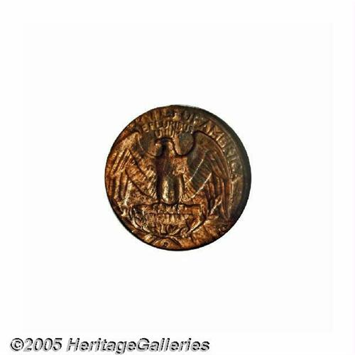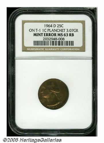 <B>1964-D<25C> Washington Quarter--Struck on a Type One Cent Planchet--MS63 Red and Brown NGC.</B></I> 3.07 grams. Bright reddish-brown surfaces show an occasional splash of deep blue patina. Struck off center with a complete rim on the right part of the obverse and reverse.