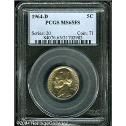 1964-D 5C MS65 Full Steps PCGS. Light olive-gold t <B>1964-D 5C MS65 Full Steps PCGS.</B></I> Light olive-gold toning accented by pale blue color at the margins. The design elements are well struck. A couple of minute, but noticeable, marks are seen on Jefferson's chin and cheek. <BR><BR><B>Important notice:</B> Heritage usually auctions material at the rate of 200-250 lots per hour. On some occasions eBay Live bid software or the Internet may not be able to keep up with the pace of the auction. We recommend placing a realistic absentee bid now as insurance to avoid disappointment. Occasionally the auctioneer may eliminate or reject an eBay Live bid, and the auctioneer may also reopen a lot after the close of the eBay live bidding (usually because we missed an audience bid), and may reject your bid even if it shows you as the winning bidder. By bidding via eBay Live, you agree that Heritage may award the lot to another bidder at its sole discretion under the circumstances described above or any other reasonable circumstances. Since eBay bids are not shown to us until we open the lot on the floor, we treat those bids just like floor bids. In most cases the floor responds before the eBay bid is presented to us, due to Internet lag time, so for consistency we have made it a policy that floor bids are always considered first over tie eBay live bids. Also please note that all Heritage lots purchased through eBay Live carry a 20% Buyer's Premium. Please make sure you read the Terms and Conditions before you bid. This lot is being auctioned in conjunction with a live floor auction by Heritage Galleries & Auctioneers. All final auction and invoice information will be supplied by Heritage Galleries & Auctioneers, and all other information should be considered preliminary. Lot:5649