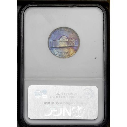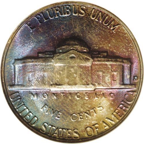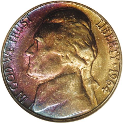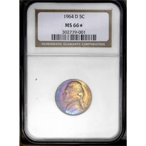 <B>1964-D<5C> MS66 <img border='0' src='http://www.heritagecoins.com/images/star.gif' width=10 height=10> NGC.</B></I> This coin appears to have been stored in a sulphur-based environment that was exposed to a heat source for some time. Variegated colors of electric-blue, bright crimson-purple, and acetylene-yellow are seen on each side. The underlying surfaces are somewhat porous in texture. <BR><BR><B>Important notice:</B> Heritage usually auctions material at the rate of 200-250 lots per hour. On some occasions eBay Live bid software or the Internet may not be able to keep up with the pace of the auction. We recommend placing a realistic absentee bid now as insurance to avoid disappointment. Occasionally the auctioneer may eliminate or reject an eBay Live bid, and the auctioneer may also reopen a lot after the close of the eBay live bidding (usually because we missed an audience bid), and may reject your bid even if it shows you as the winning bidder. By bidding via eBay Live, you agree that Heritage may award the lot to another bidder at its sole discretion under the circumstances described above or any other reasonable circumstances. Since eBay bids are not shown to us until we open the lot on the floor, we treat those bids just like floor bids. In most cases the floor responds before the eBay bid is presented to us, due to Internet lag time, so for consistency we have made it a policy that floor bids are always considered first over tie eBay live bids. Also please note that all Heritage lots purchased through eBay Live carry a 20% Buyer's Premium. Please make sure you read the Terms and Conditions before you bid. This lot is being auctioned in conjunction with a live floor auction by Heritage Galleries & Auctioneers. All final auction and invoice information will be supplied by Heritage Galleries & Auctioneers, and all other information should be considered preliminary. Lot:1172 <BR><BR><B>Winning Notification and Billing:</B> After the FINAL session in this auction is complete, Heritage will send e-mail and snail mail invoices. This process normally takes several days. All final auction and invoice information will be supplied by Heritage Galleries & Auctioneers, and all other information should be considered preliminary. <BR><BR>This auction will be conducted on a live auction floor and over the Internet through eBay Live. If you choose to place an absentee bid, please take a moment to <font color='#0000ff'><u><a href='http://pages.ebay.com/liveauctions/help/before/laabsentee.html'>learn how eBay Live absentee bidding works</a></u></font><font color='#000000'>