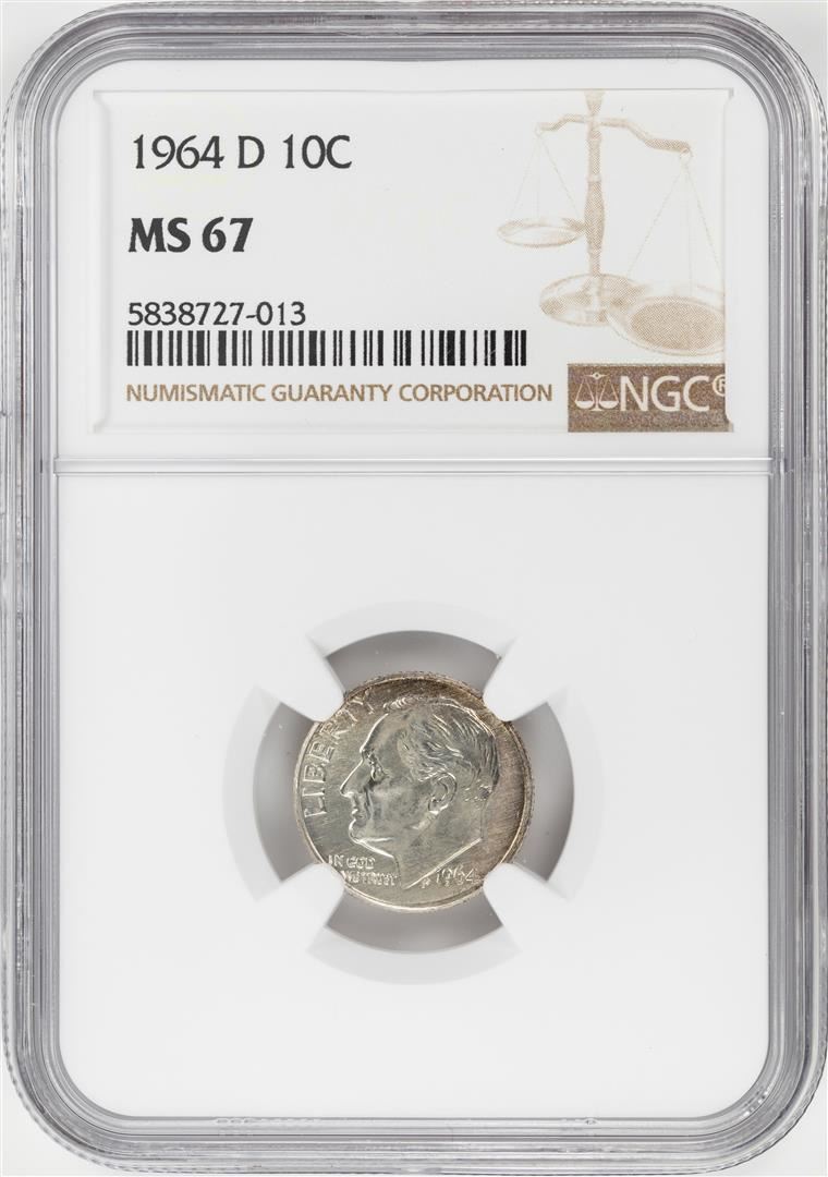 One 1964-D Roosevelt Dime Coin NGC MS67. NGC Certified.