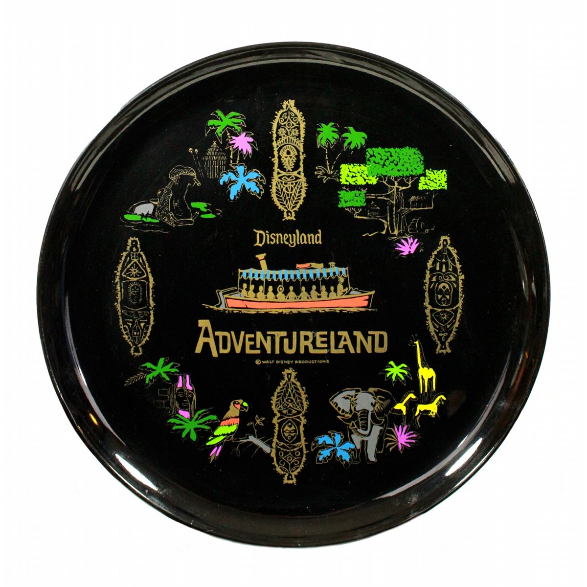 A beautiful vintage souvenir tray featuring artwork from Adventureland in vivid colors over a black tray that provides a unique and modern look. Measures 10.5" in diameter, and is in excellent condition.