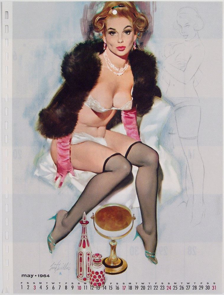 This is a vintage May, 1964 page from a Brown & Bigelow calendar featuring a risque pin-up print by Fritz Willis. SIZE: Approx. 9" x 12".