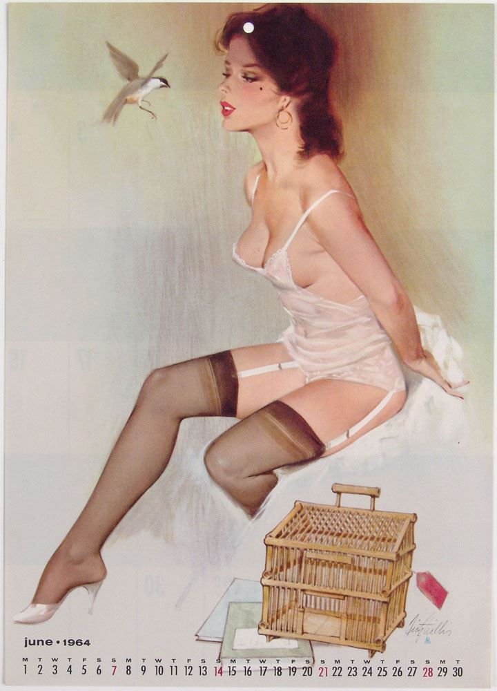 This is a vintage June, 1964 page from a Brown & Bigelow calendar featuring a risque pin-up print by Fritz Willis. SIZE: Approx. 8 1/2" x 12".
