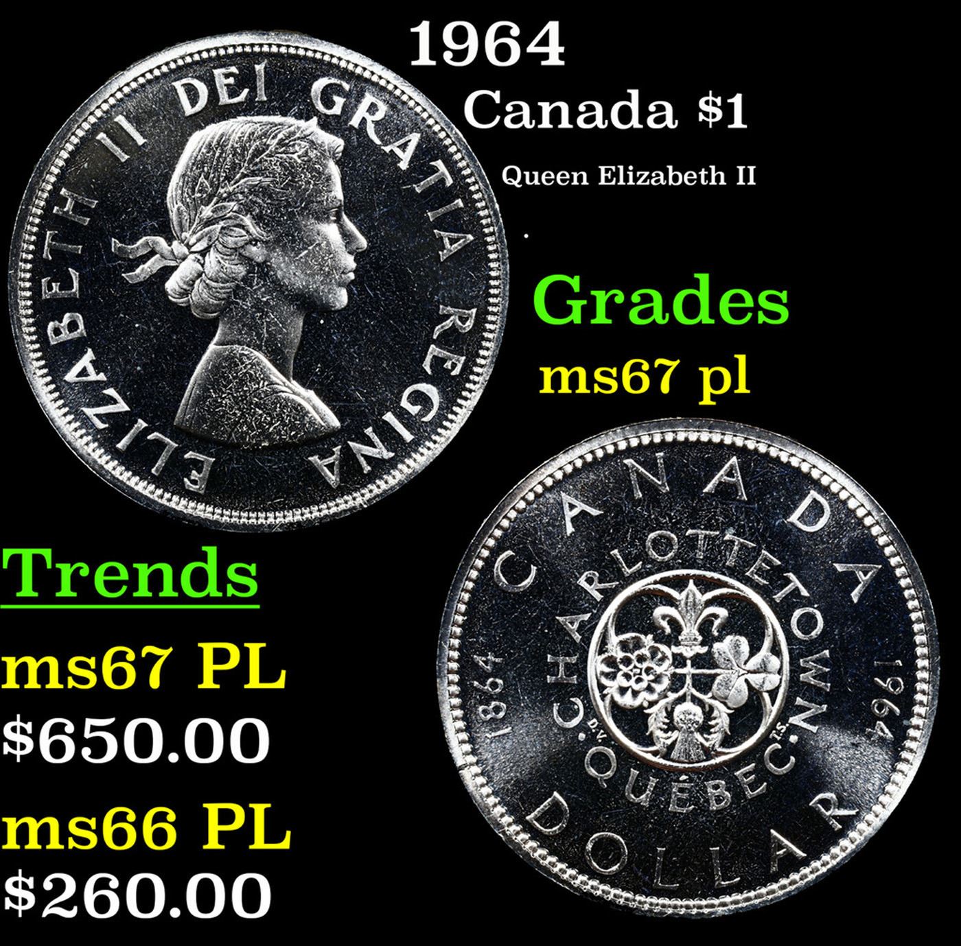 1964 Grades GEM++ PL. Elizabeth was born in Mayfair, London, as the first child of the Duke and Duchess of York (later King George VI and Queen Elizabeth). Her father acceded to the throne in 1936 upon the abdication of his brother, King Edward VIII, making Elizabeth the heir presumptive. She was educated privately at home and began to undertake public duties during the Second World War, serving in the Auxiliary Territorial Service. In November 1947, she married Philip Mountbatten, a former prince of Greece and Denmark, and their marriage lasted 73 years until Philip's death in 2021. They had four children: Charles, Prince of Wales; Anne, Princess Royal; Prince Andrew, Duke of York; and Prince Edward, Earl of Wessex.When her father died in February 1952, Elizabeth—then 25 years old—became queen regnant of seven independent Commonwealth countries: the United Kingdom, Canada, Australia, New Zealand, South Africa, Pakistan, and Ceylon, as well as Head of the Commonwealth. Elizabeth has reigned as a constitutional monarch through major political changes such as the Troubles in Northern Ireland, devolution in the United Kingdom, the decolonisation of Africa, and the United Kingdom's accession to the European Communities and withdrawal from the European Union. The number of her realms has varied over time as territories have gained independence, and as some realms have become republics. Her many historic visits and meetings include state visits to the People's Republic of China in 1986, the Russian Federation in 1994, the Republic of Ireland in 2011, and visits to or from five popes.Significant events have included Elizabeth's coronation in 1953 and the celebrations of her Silver, Golden, Diamond and Platinum jubilees in 1977, 2002, 2012, and 2022, respectively. Elizabeth is the longest-lived and longest-reigning British monarch, the oldest and longest-serving incumbent head of state, and the second-longest reigning sovereign monarch in world history. She has faced occasional republican sentiment and press criticism of the royal family, particularly after the breakdown of her children's marriages, her annus horribilis in 1992, and the death in 1997 of her former daughter-in-law Diana, Princess of Wales. However, support for the monarchy in the United Kingdom has been and remains high, as does her personal popularity. Elizabeth died aged 96 at Balmoral Castle, Aberdeenshire, and was succeeded by her eldest son, Charles III.