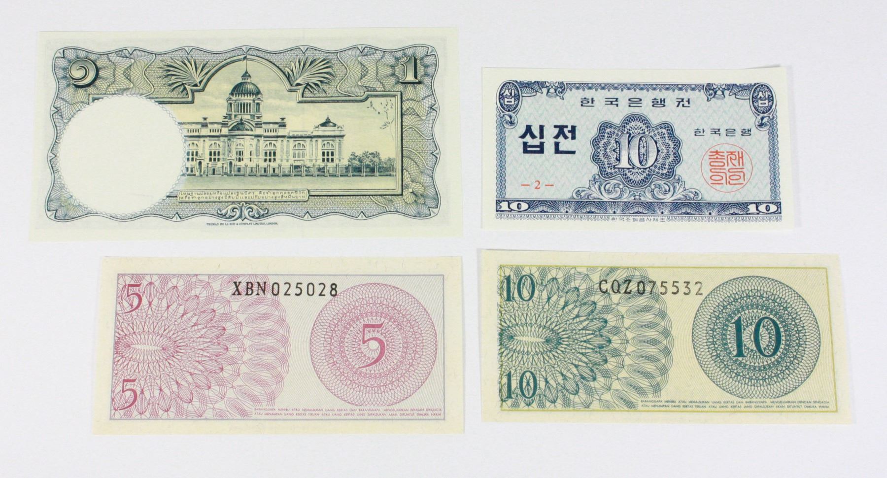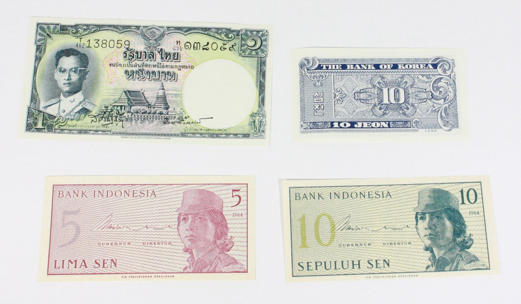 WITH 1954 THAILAND 1 BAHT PAPER MONEY KING RAMA IX, AND 1962 SOUTH KOREAN 10 JEON BANK NOTE